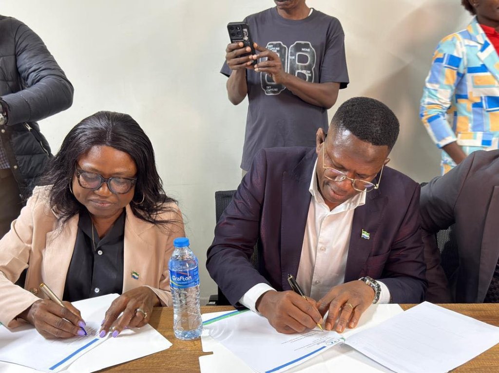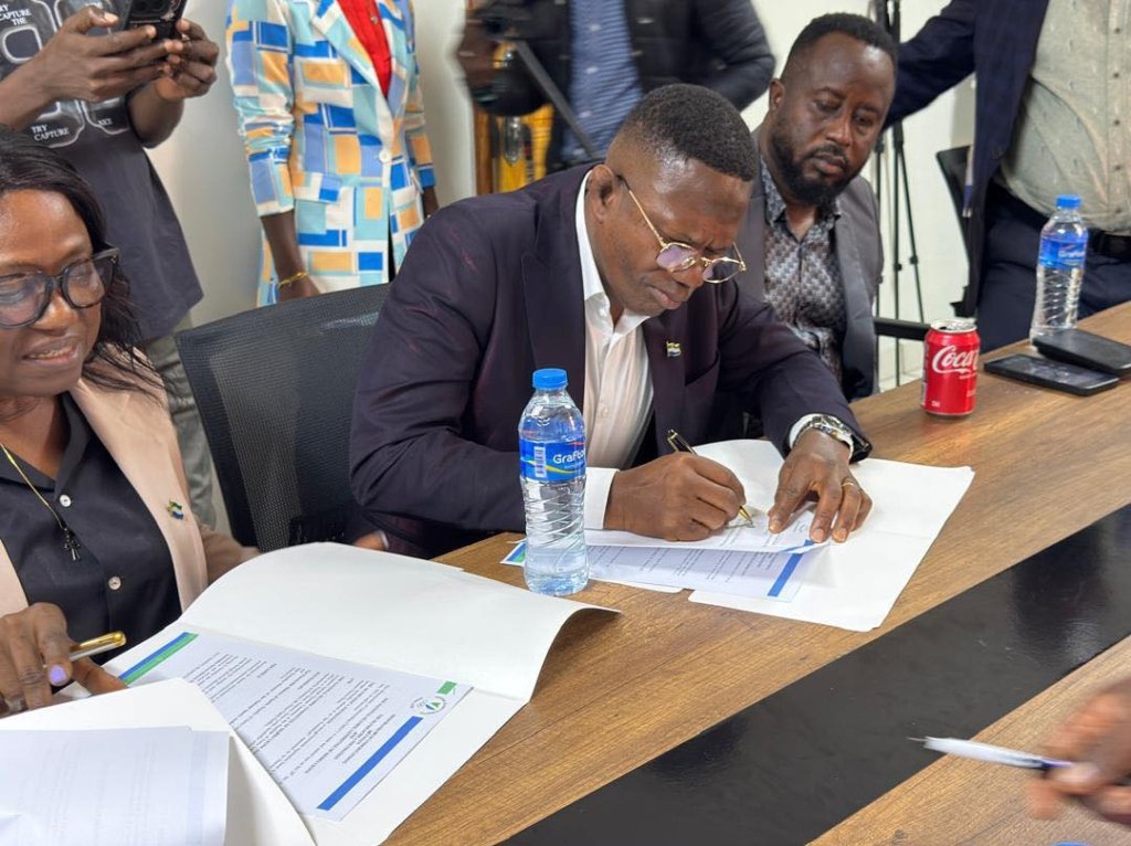 Signature du MOU pour la construction du Centre Olympafrica de Lunsar en Sierra Leone, en présence de la Ministre des Sports, du Président de la Commission Nationale des Sports et du Président du Comité Olympique.